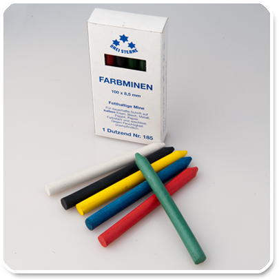 DREI STERNE Farbminen Wählen Sie eine Produktvariante Wählen Sie zuerst eine Produktvariante Nr. 184 - Öl- und fettfrei - abwischbar - auswaschbar Nr. 185 - Fetthaltige Mine. Für dauerhafte Schrift auf... Nr. 186 - Ölhaltige Mine. Zum Schreiben auf feuchtem und... Nr. 187 - Wachshaltige Mine. Zum Schreiben auf Glas, Porzellan... Nr. 190 - Grafitmine für Schreiner, Zimmerleute, Förster usw. verfügbar in weiß gelb rot blau grün schwarz Wählen Sie zuerst eine Produktvariante DREI STERNE Farbminen Größe ca. 100 x 8,5mm Ø Rund, gespitzt, unpapiert für Halter INTUS 8 12 Minen einer Farbe in einer Schachtel. Kundenrezensionen Es gibt noch keine Rezensionen für dieses Produkt.